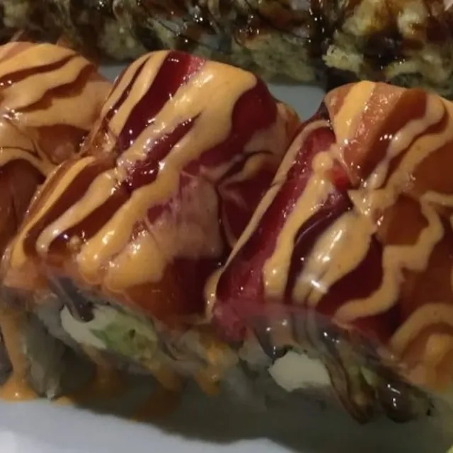 red snapper, shrimp tempura, cream cheese, avocado, topped with crunchy salmon, tuna, salmon, spicy mayo, and eel sauce
