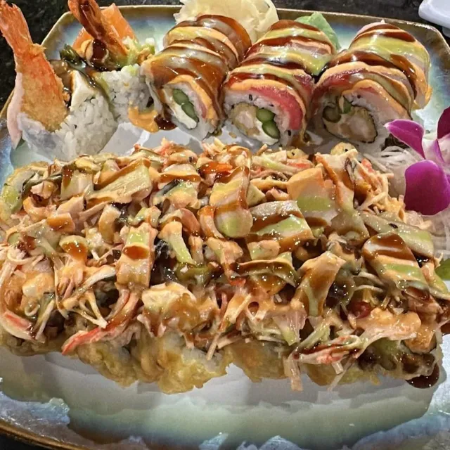 escolar, spicy tuna, deep-fried, topped with seafood salad, eel sauce, spicy mayo