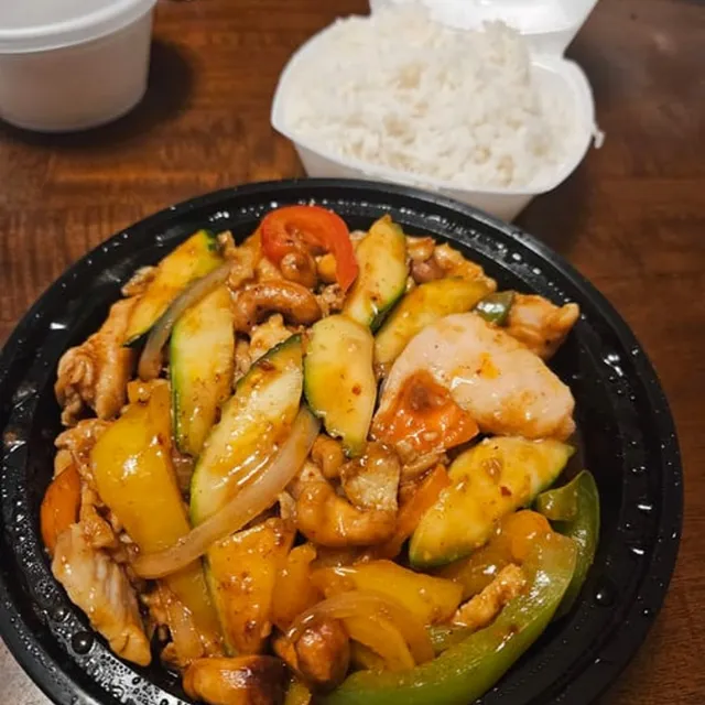 mushroom, bell peppers, onions, cashew nuts, carrots, and zucchini stir fried in brown sauce