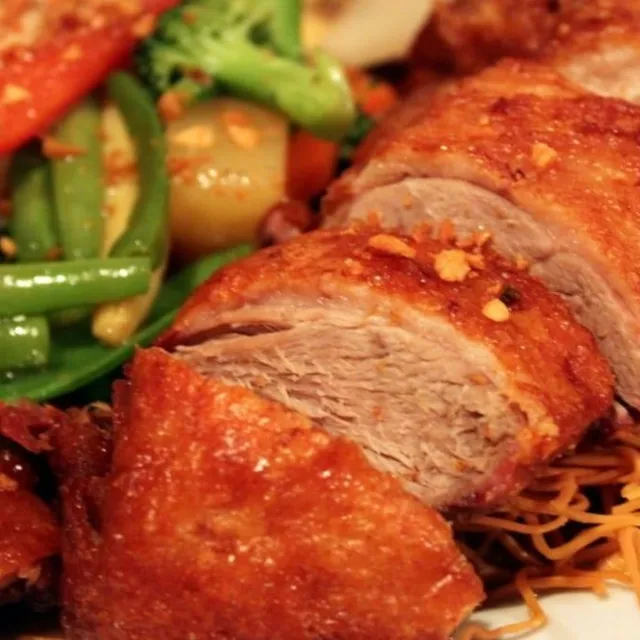 (half). boneless tender duckling, delicately seasoned and deep-fried, topped with steamed broccoli, snow pea pods, and a special garlic sauce.