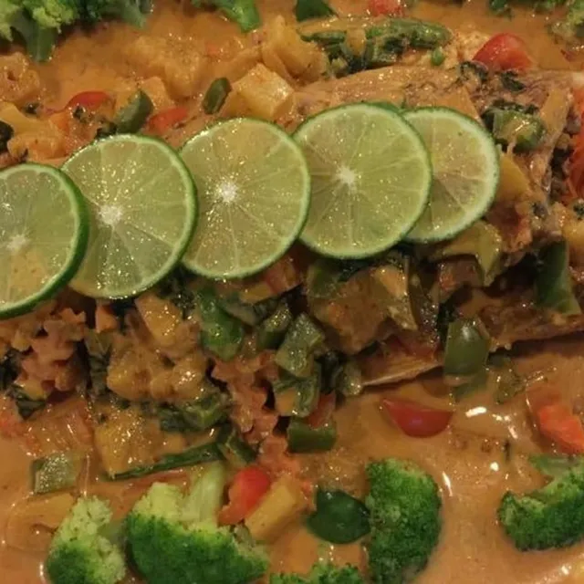 deep fried red snapper filet, with bell peppers, onions, broccoli, carrots, snow peas, zucchini, and sweet basil, in a red curry sauce