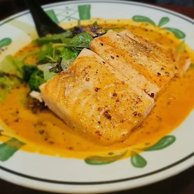 grilled salmon, broccoli, snow peas, eggplant, and asparagus in red or green curry sauce